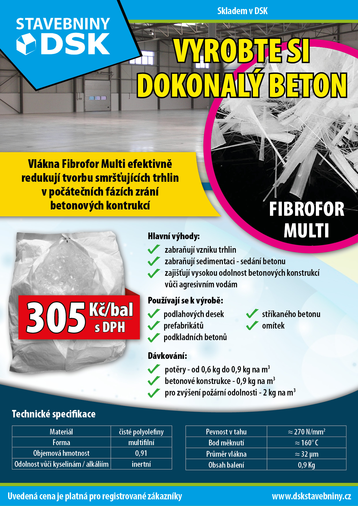 Využijte při betonování vlákna Fibrofor, které zabraňují vzniku trhlin či sedání betonu. Využití naleznou při výrobě podlahových desek, prefabrikátů, podkladních betonů, stříkaného betonu, ale například i omítek.